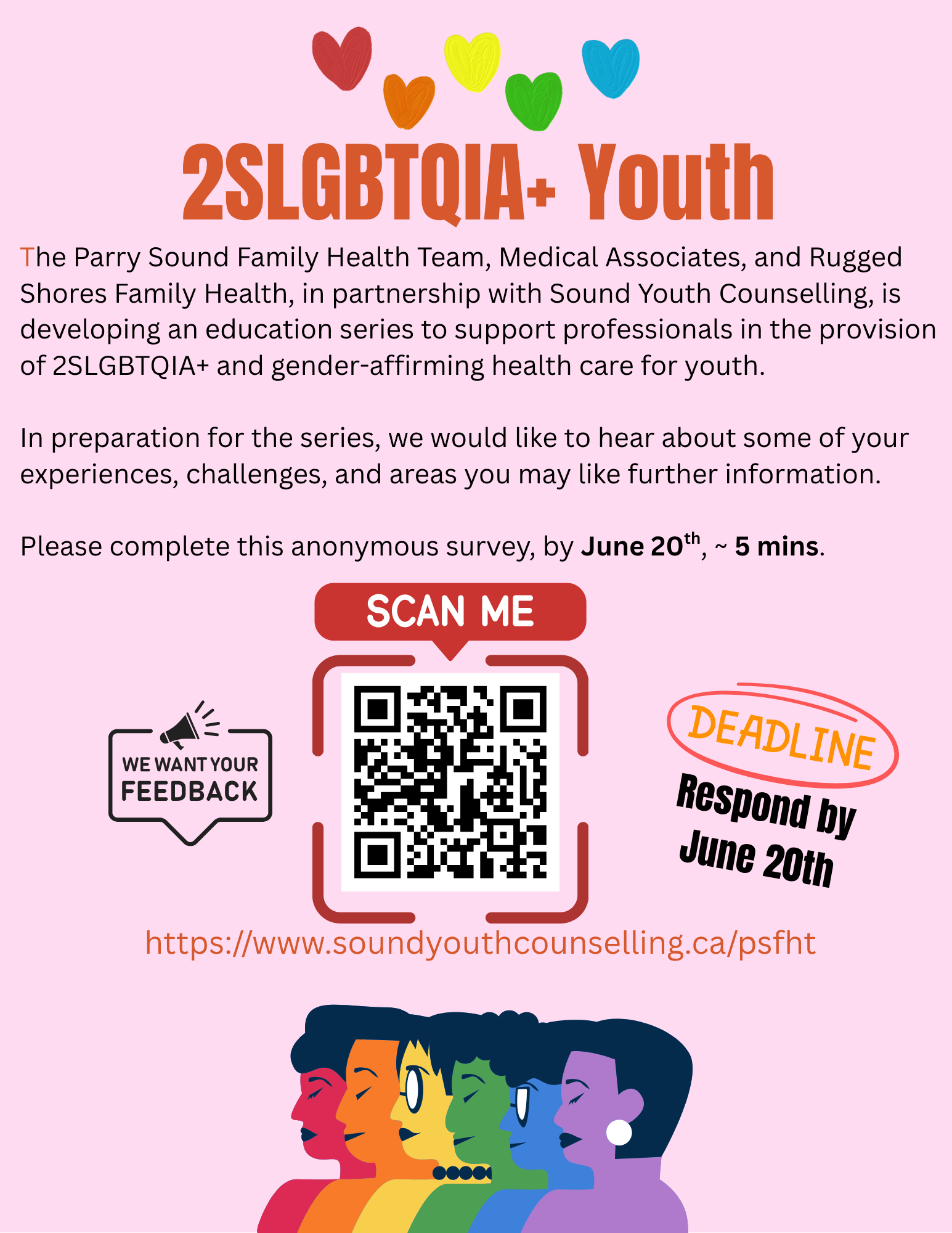 The Parry Sound Family Health Team, Medical Associates, and Rugged Shores Family Health, in partnership with Sound Youth Counselling, is developing an education series to support professionals in the provision of 2SLGBTQIA+ and gender-affirming health care for youth and is seeking feedback and insights.